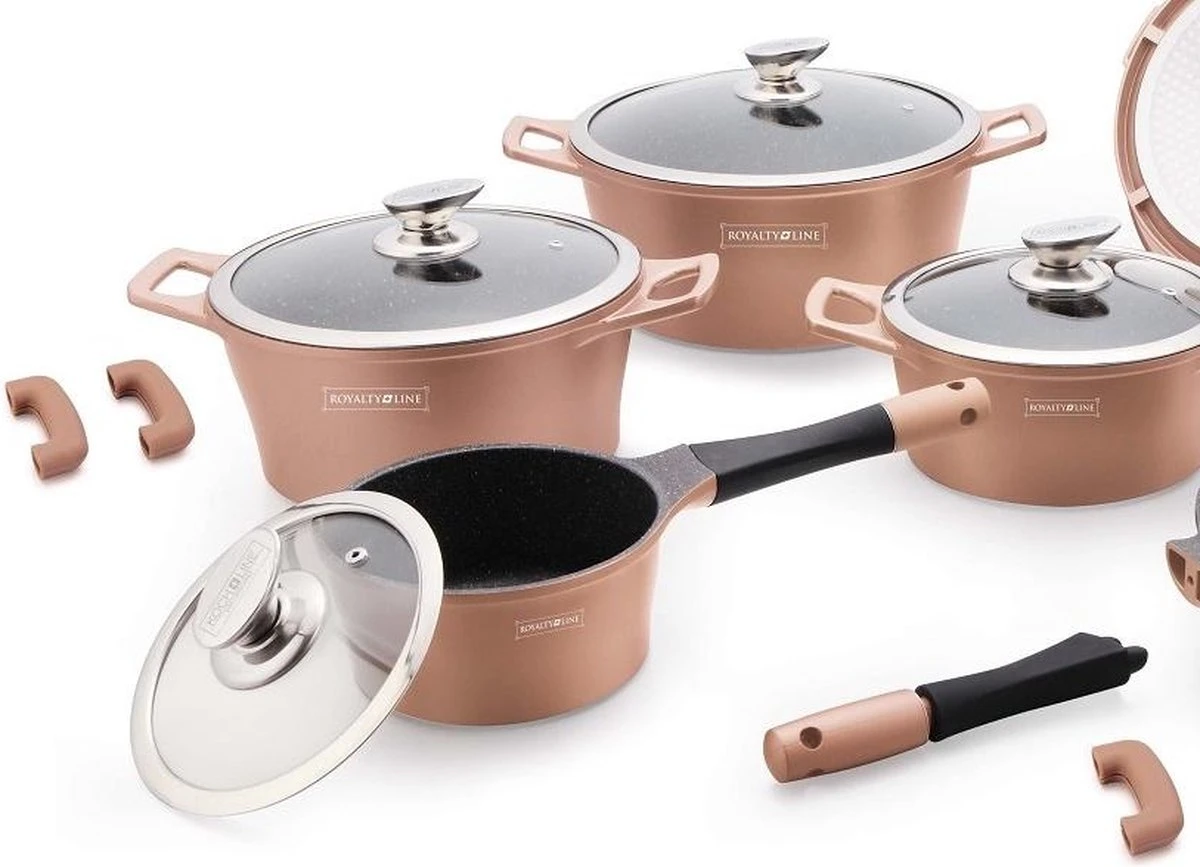 Een zeer uitgebreide set van Royalty Line Switzerland is een goede eerste stap naar goed en gezond koken. De pannen hebben een hoogwaardige marmercoating en zijn geschikt voor alle warmtebronnen, inclusief inductie en oven. Kortom een pannenset die je niet mag missen in huis!