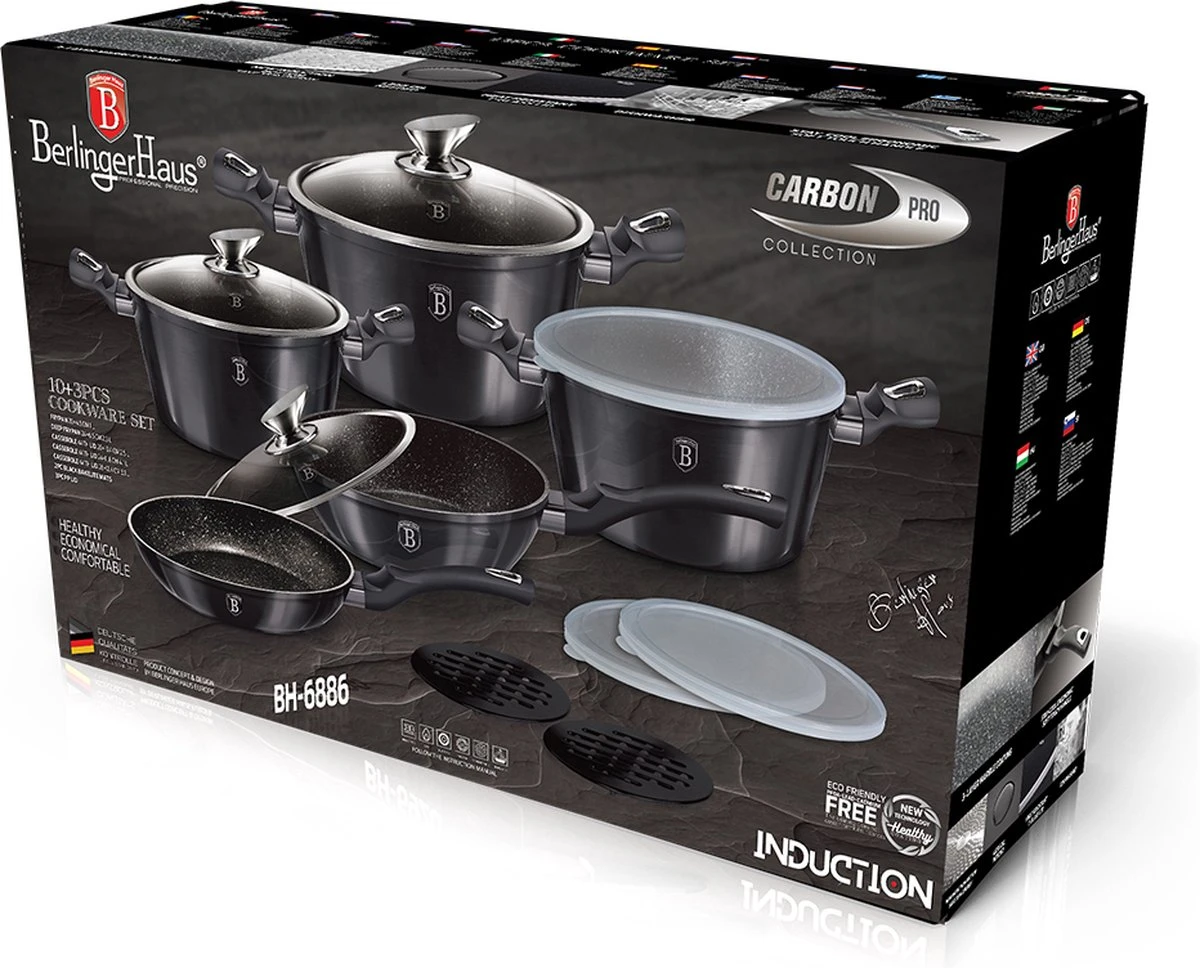 Deze Berlinger Haus Metallic Line pannenset bestaat uit dertien onderdelen, inclusief pannen en deksels. De pannen zijn voorzien van een 3-laags marmeren antiaanbaklaag, ergonomische soft-touch handgrepen, een Turbo inductiebasis en natuurlijk een elegant ontwerp. De T-glazen deksels hebben een RVS knop en 18/10 RVS ring en zijn gemaakt van kunststof.